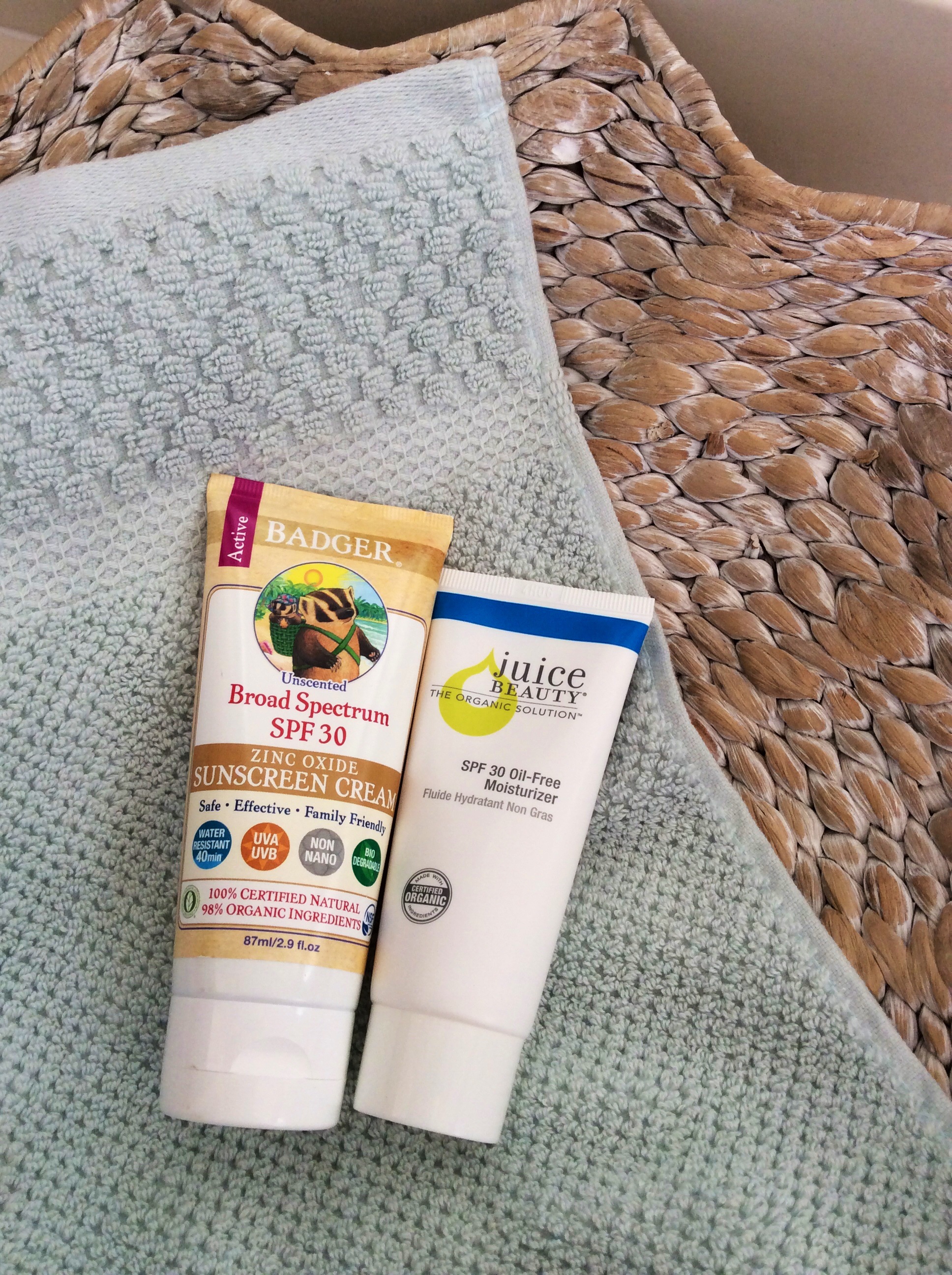 sunscreen. It safely sits on top of your skin and protects your skin from UVA/UVB rays. Add in some sunflower oil, vitamin E and sea buckthorn oil and you have a skin-loving antioxidant sunblock safe enough for children and one you can feel good about applying. Two of my favorites are Badger Unscented SPF 30 zinc oxide, which can be found at most health food store such as Sprouts and Whole Foods, with 98% natural ingredients and Juice Beauty SPF 30 oil free moisturizer, which can be purchased at Ulta.
